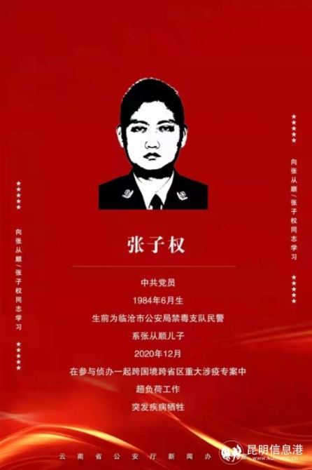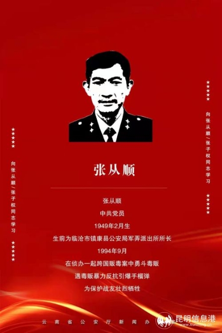 张从顺生前系云南省临沧市镇康县公安局军弄派出所所长。1994年,他在侦办一起跨国贩毒案中,遭犯罪嫌疑人暴力反抗,为保护战友壮烈牺牲,被评定为“烈士”。张子权生前为云南省临沧市公安局禁毒支队民警,系张从顺之子。2020年,他在参与侦办一起重大专案中超负荷工作,突发疾病牺牲。张从顺、张子权均被追授“全国公安系统二级英雄模范”“云南省优秀共产党员”等称号。今年3月,云南省委宣传部追授张从顺、张子权父子“云岭楷模”称号。4月,云南省委作出向张从顺、张子权同志学习的决定。他们长期奋战在祖国西南边陲禁毒前沿阵地,一心向党、忠诚履职,用宝贵的生命书写了人民公安的使命担当,充分展现了党领导的社会主义国家人民警察克己奉公、无私奉献的良好形象。