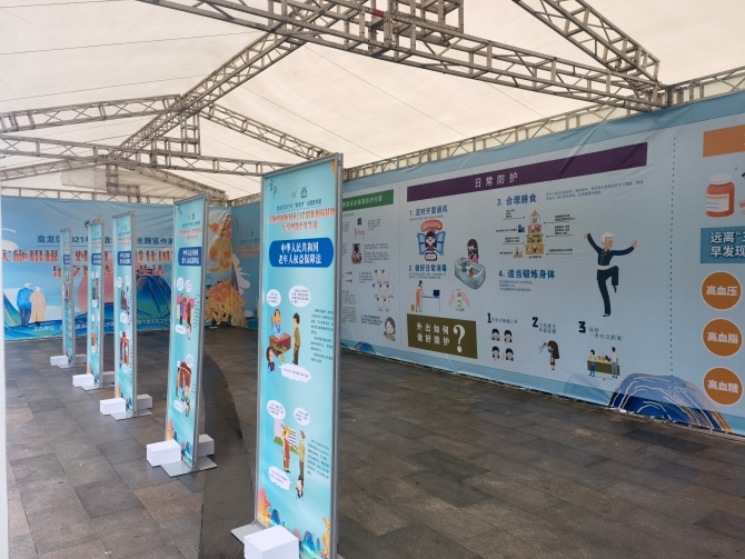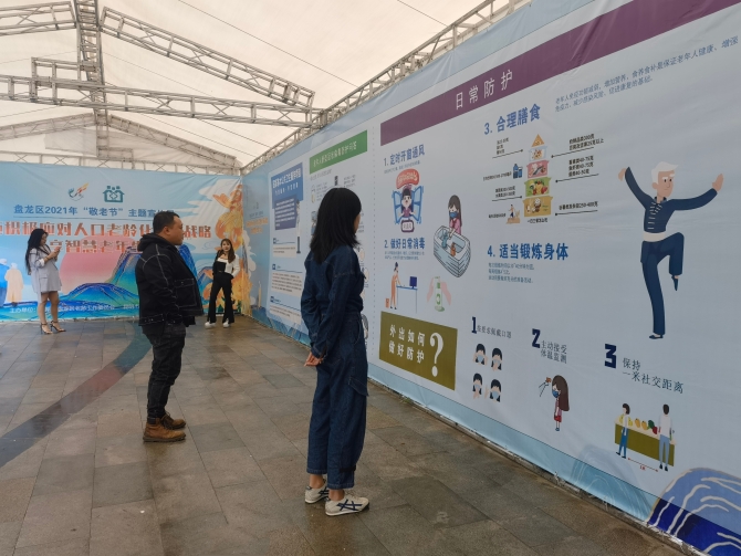 活动现场,《老年人新型冠状病毒防护问答》《昆明市老年人权益保障条例》等系列展板整齐地摆放在广场前,虽然天气寒冷,仍有不少市民驻足围观学习。展板内容从普及科学防控知识、老年人健康管理、智慧健康养老技术到老年人应享受的权益等方方面面 ,积极主动宣传国家基本公共卫生服务政策,普及健康知识,聚焦老年人权益保障,弘扬中华民族敬老、爱老的传统美德。