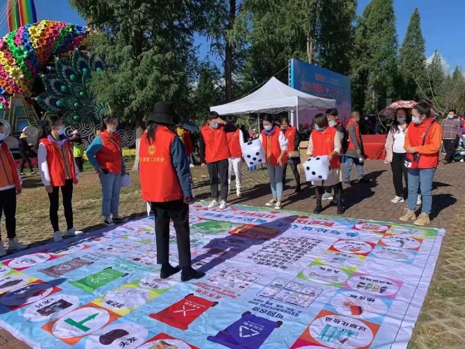 随后,主持人带领大家宣读了活动倡议书,并正式开始志愿服务宣传活动。垃圾分类飞行棋、垃圾分类套圈游戏、垃圾分类大转盘、垃圾分类投壶游戏、垃圾分类你比我猜五大游戏让职工们既乐在其中,也潜移默化地学习着垃圾分类的知识。不同的游戏场地中,职工们三两组队,纷纷参与其中,“指甲油是什么垃圾呀?”“矿泉水瓶肯定是可回收垃圾。”透过简单的游戏,一场生活垃圾分类的小课堂正有声有色地开展着。