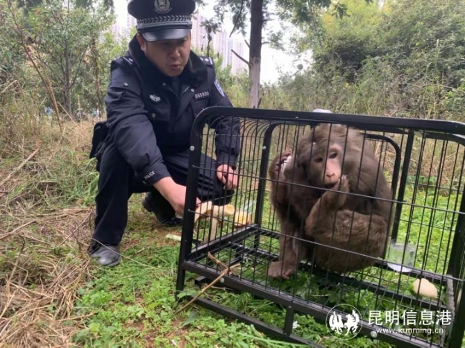 民警把外套脱了,用外套慢慢的披在猴子的身上并用手安抚,猴子顾着吃,并不反抗,民警将外套全部裹在猴子身上将猴子抓住,然后将猴子放进提前准备好的笼子里。经初步观察,这只猴是熊猴,属国家二级野生保护动物。