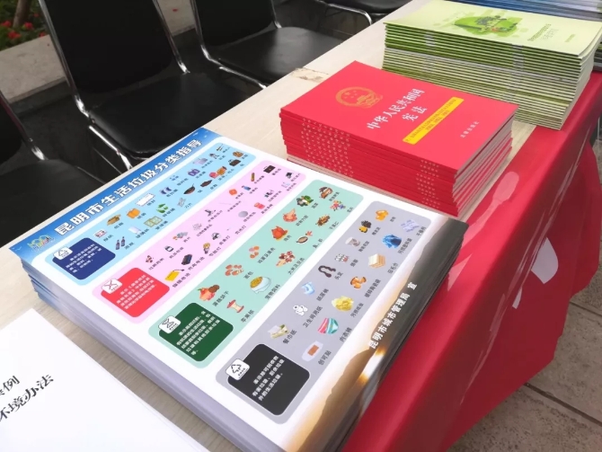分发昆明市生活垃圾分类宣传指导手册、昆明市餐厨废弃物管理办法等宣传资料,从生活垃圾分类的意义、生活垃圾投放标准等方面引导市民主动参与生活垃圾分类,还就市民日常遇到的生活垃圾分类难题进行耐心指导。