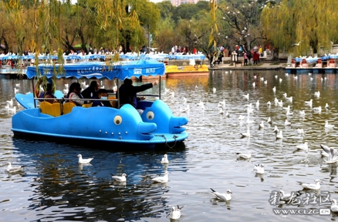 也可以划着小船,在翠湖和海鸥互逐,在船上和海鸥嬉戏玩耍,真是其乐融融。