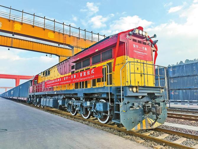 12月17日,满载35个集装箱的中老铁路国际货运(安宁-万象)列车从安宁市桃花村火车站缓缓驶出。列车的开行,将为昆明与东南亚国家经济贸易往来打通一条更加安全、便捷的运输通道。