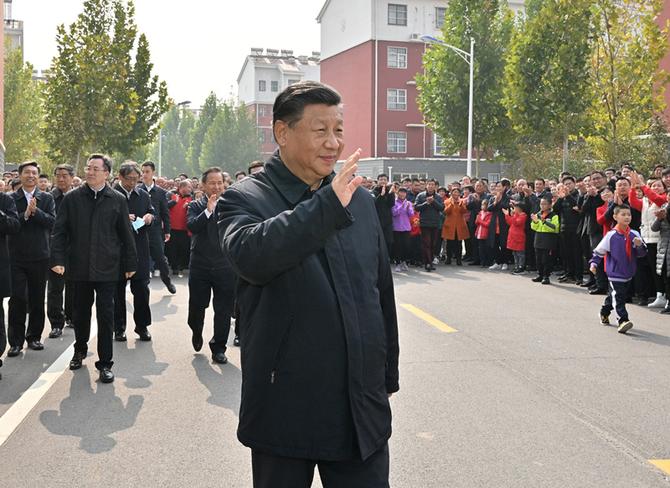 2021年10月22日,习近平总书记在山东省济南市主持召开深入推动黄河流域生态保护和高质量发展座谈会并发表重要讲话。这是座谈会前,总书记在东营市垦利区董集镇杨庙社区考察时,向社区干部群众挥手致意。