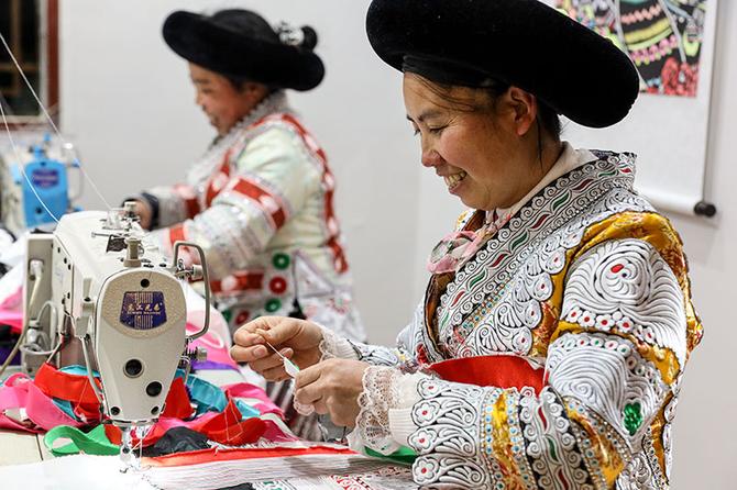 2021年2月3日,贵州省毕节市黔西县新仁苗族乡化屋村,苗族妇女在扶贫车间加工服装。