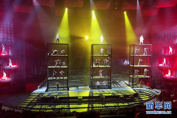 图为大型红色舞台剧《重庆 1949》演出现场。由5个大型圆环构件而成的舞台可实现360度旋转。新华网 发