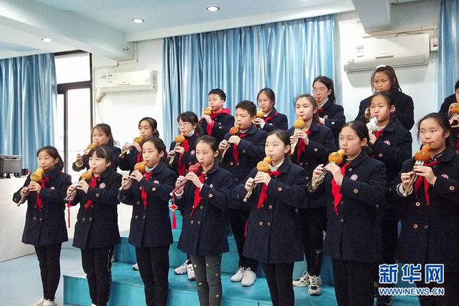 图为川外附小的学生们练习用葫芦丝演奏红色歌曲。新华网发(王琦 摄)