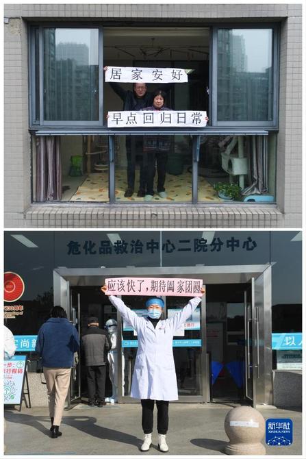 这张拼版照片的上图:12月16日,在百官街道阳光假日小区,中医诊所工作人员石先生和女儿向正在一线抗疫的家人传达问候。