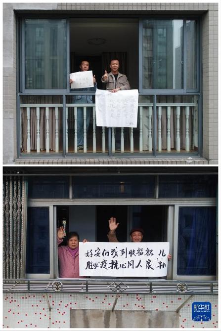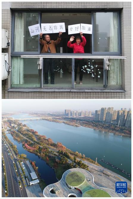 下图:12月20日,在百官街道文化新村,退休工人曹先生和经女士在自家窗口向家人传达回音(无人机照片)。