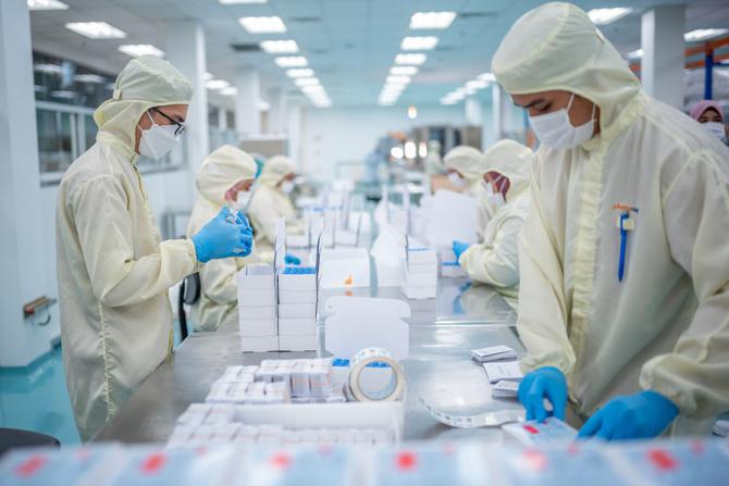 在马来西亚吉隆坡郊区的发马公司灌装工厂,工人在包装本地灌装生产的科兴疫苗(10月5日摄)。新华社记者 朱炜 摄