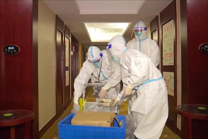 记者了解到,该隔离点配有2名感控专家、5名医护人员和5名工作人员,负责为隔离人员进行核酸检测、测量体温、配送三餐、垃圾处理、环境消杀等工作。采访时,工作人员正在隔离区送餐,他们挨个房间敲门通知大家,然后把打包好的餐盒放在门口的椅子上等着他们来取。