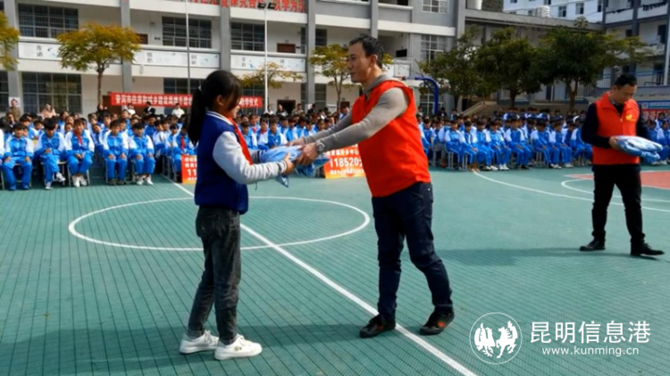 滇西南区域投资总监姚垚及普洱片区负责人张圣受碧桂园滇西南区域总裁彭龙委托,将崭新的校服套装送到孩子们手中。供图