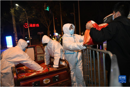12月22日晚,陕西省石油化工学校工作人员在隔离栏处转运大米。新华社记者 李一博 摄