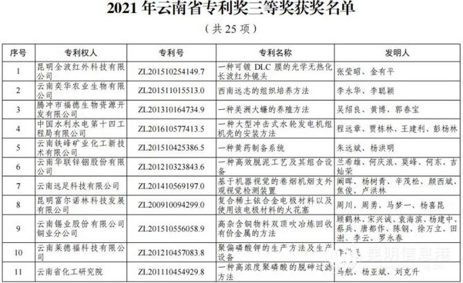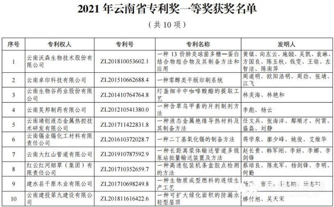 据悉,云南沃森生物技术股份有限公司“一种13价肺炎球菌多糖—蛋白结合物组合物及其制备方法和应用”等10项发明专利获一等奖;景洪宏臻农业科技有限公司“黑牛肝菌栽培方法以及黑牛肝菌”等15项发明专利获二等奖;昆明全波红外科技有限公司“一种可镀DLC膜的光学无热化长波红外镜头”等25项发明专利获三等奖。