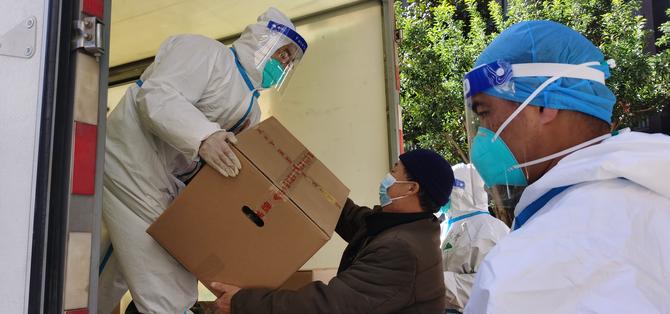 “一栋卸120箱生活物资……”12月29日14:00,一辆辆疫情防控保障物资车辆正在管控区的蓝光天娇城一期、三期内卸货中,防疫工作人员和小区志愿者正有序进行搬运、登记、配送。