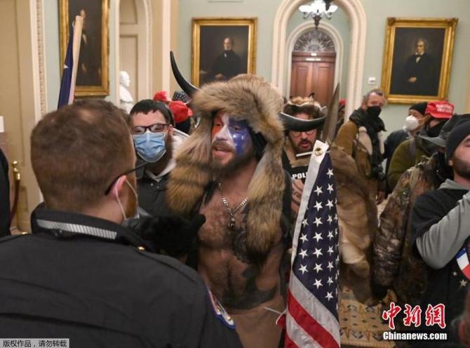 2021年1月6日,美国参众两院确认选举人团投票结果的联席会议,因特朗普支持者闯入国会大厦引发大规模骚乱而被迫中断,现场极度混乱。图为特朗普支持者进入美国国会大厦。