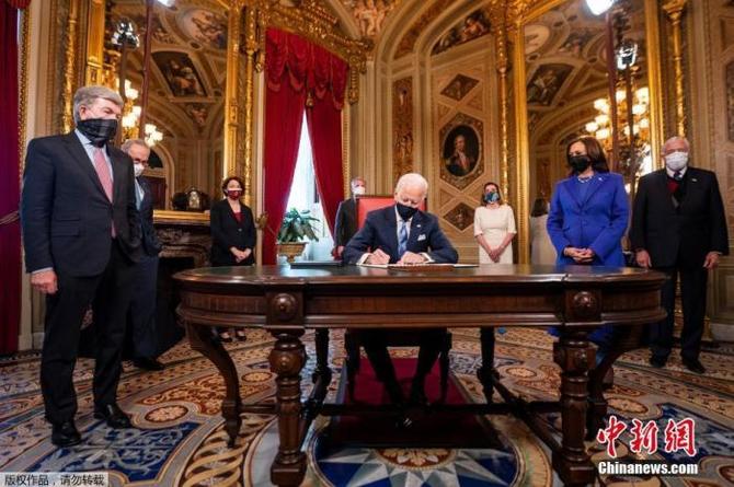 资料图:2021年1月20日,民主党人拜登在国会山正式宣誓就任美国第46任总统。图为美国总统拜登就职后签署一系列文件。
