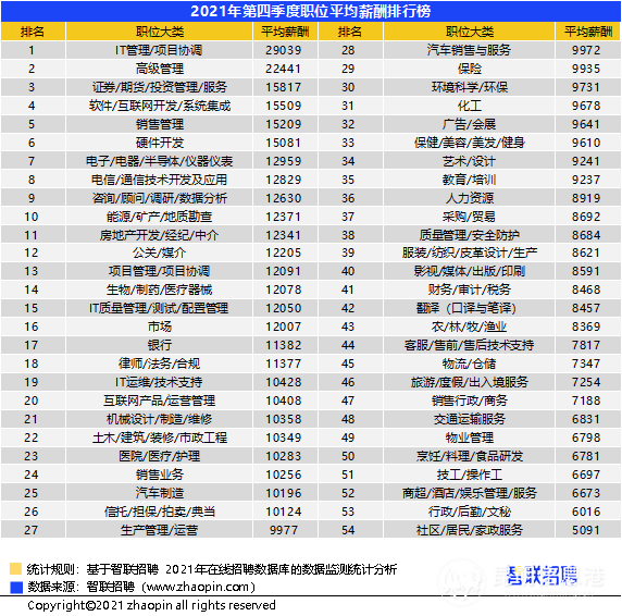 行业方面,2021年四季度信托/担保/拍卖/典当行业超过基金/证券/期贷/投资行业,以12826元/月的薪资重回榜首,能源/矿产/采掘/冶炼(12081元/月)环比上涨12.8%,跃居第4位。疫情促进了线上信息技术服务等外包服务需求增长,该行业本季度薪资涨幅达13.3%。教培业受“双减”政策影响,整体招聘需求减少,薪资也有所下降,四季度薪酬环比下降1%;旅游业也受到疫情反扑影响,薪酬下降1.5%。