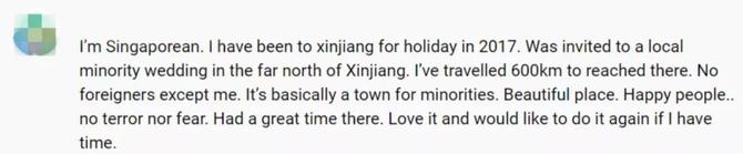▲我是新加坡人,在2017年曾到新疆度假。当时我在疆北被邀请参加一个当地少数民族的婚礼,那是一个主要由少数民族组成的城镇,风景秀丽,民众欢乐......没有恐怖或恐惧。我在那里度过了一段美好的时光。我喜欢那里,如果有时间,我还想再去一次。