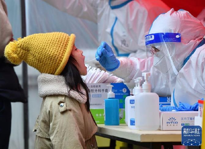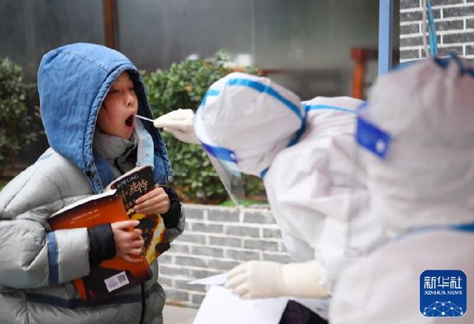 1月10日,在郑州市二七区政通路一处核酸检测点,医务人员为小朋友进行核酸检测取样。
