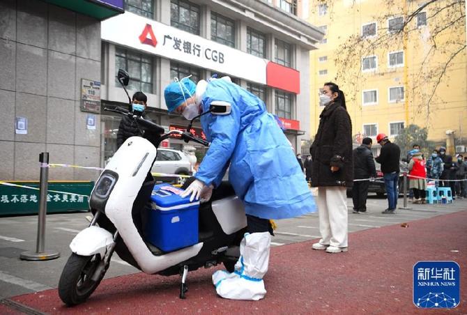 1月10日,在郑州市纬一路核酸检测点,医护人员在封装核酸样本箱,准备送检。