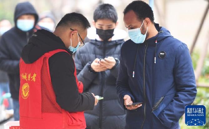 1月10日,在郑州市高新区枫杨办事处誉园核酸检测点,志愿者帮助外籍人员扫码登记。