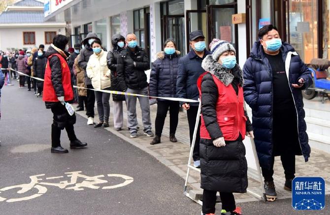1月7日,在郑州市经八路办事处一处检测点,75岁的志愿者耿小娣(左)在引导市民排队。