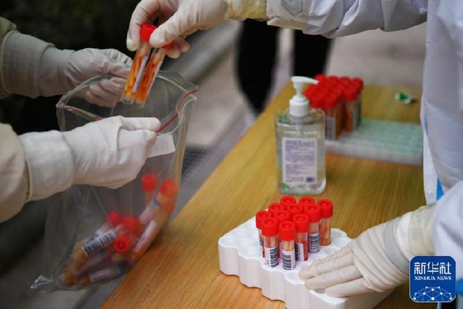 1月10日,在郑州市高新区枫杨办事处誉园核酸检测点,志愿者(左)帮助医务人员收集采样管。