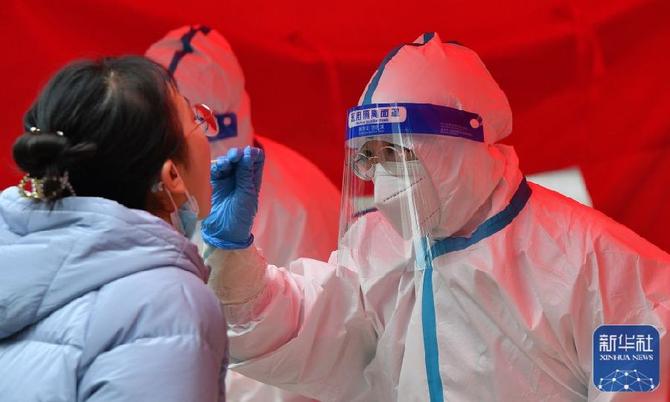 1月10日,在郑州市二七区政通路一处核酸检测点,医务人员为市民进行核酸检测取样。