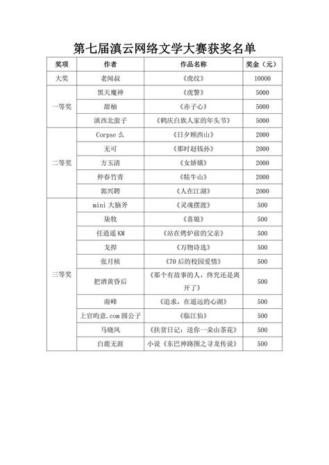 由中共昆明市委网信办、昆明市文联主办,昆明网络文学协会、昆明信息港彩龙社区承办的第七届滇云网络文学大赛于2月3日启动,9月30日截稿,共有3014篇(组)作品参赛。通过评选,作者“老闻叔”的作品《虎纹》荣获第七届滇云网络文学大奖;“黑天魔神”的《虎警》、“甜柚”的《赤子心》、“滇西北蛮子”的《鹤庆白族人家的年头节》3部作品获一等奖;“Corpse么”的《日夕顾西山》、“无可”的《那时赵钱孙》、“方玉清”的《女娇娥》、“郭兴聘”的《人在江湖》、“仲春竹青”的《牯牛山》5部作品获二等奖;“柒牧”的《喜娘》、“mini大脑斧”的《灵魂摆渡》、“张月桢”的《70后的校园爱情》、“上官昀意.com圆公子”的《临江仙》、“白鹿无涯”的《东巴神路图之寻龙传说》、“任逍遥KM”的《站在烤炉前的父亲》、“把酒黄昏后 ”的《那个有故事的人,终究还是离开了》、“马晓凤”的《扶贫日记:送你一朵山茶花》、“戈捍”的《万物诗选》、“南峰”的《追求,在遥远的心湖》10部作品获三等奖。