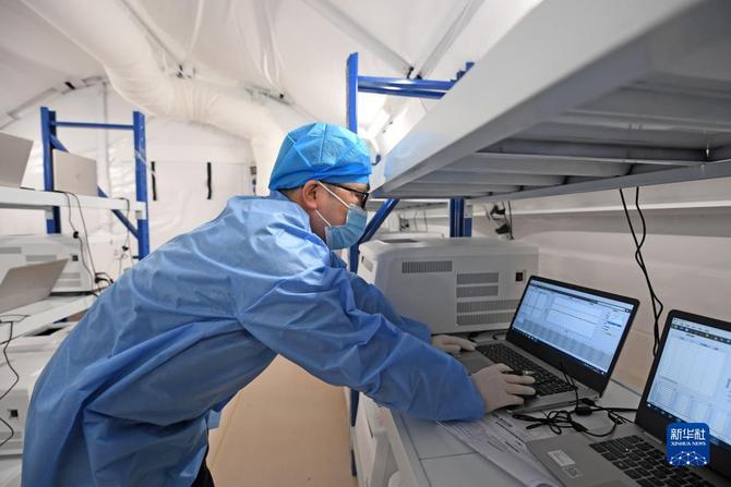 1月13日,在天津市北辰区某高校,气膜实验室工作人员在扩增分析区分析核酸样本数据。新华社记者赵子硕摄