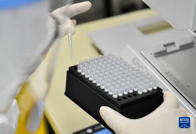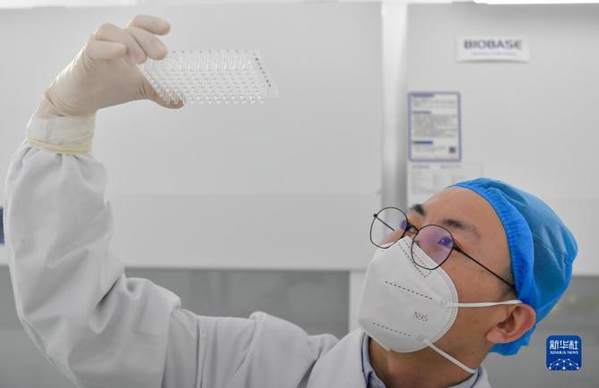 1月13日,在天津市北辰区某高校,气膜实验室工作人员在进行试剂配置。新华社记者孙凡越摄