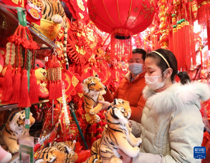 农历虎年春节将至,各地年货市场年味渐浓,人们忙着选购春节饰品,红红火火迎接新春佳节。