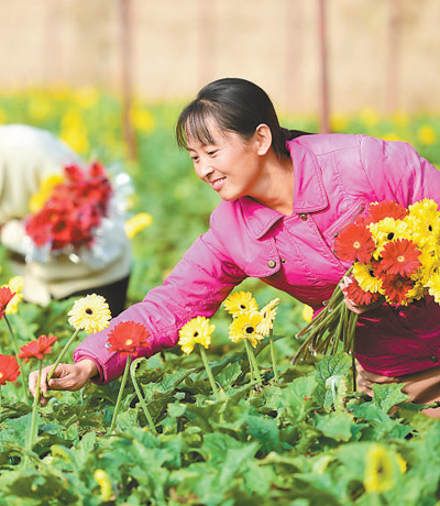 河北省献县十五级乡大棚花卉基地,农民在采收非洲菊。当地发展大棚花卉等产业,带动农户就业。