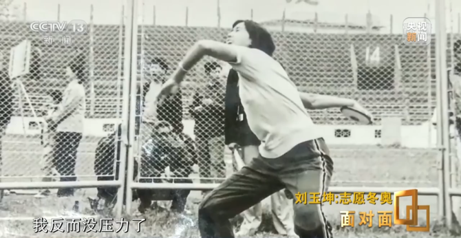 刘玉坤:这个时候我反而没压力了,我就躺到地上盖着棉袄,想了一遍技术,我就想我最后一饼一定要用旋转技术,我练了那么多年,转好了就能比原地远出好几米。我起来骑着这个线就开始旋转,没有杂念,就在这一瞬间,一转,就出去了。