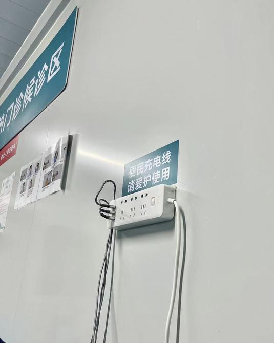 在等待叫号就诊、抽血报告、核酸检验报告的过程中,需要到发热门诊候诊区等待。候诊区设施配备完善,有座椅、躺椅、饮水机、手机充电器等,由于等待核酸检验报告时间较长,等待区还张贴了外卖地址信息,外卖送达后,可以到取餐点领取。