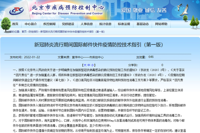 北京市疾控中心日前发布《新冠肺炎流行期间国际邮件快件疫情防控技术指引(第一版)》。