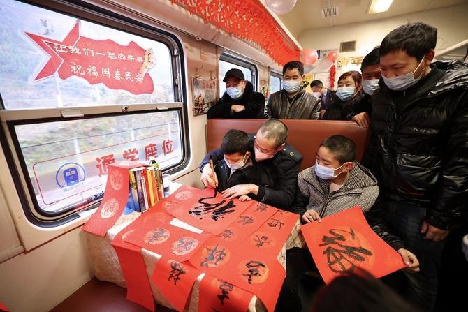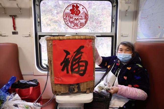 “各位老乡,早上好,今天是农历小年,我们将举行送祝福活动。”列车员卫进忠的话音刚落,就看见车厢里老乡们急忙围拢过来。他把写好的春联送给身边背着背篓的一位老人,将一张福字贴在了背篓上。拿到对联、福字的老人满脸笑容,连忙道谢。“火车快开, 别让我等待,火车快开,请你赶快送我到远方家乡……”在与旅客互动中,列车员李爱民激情演唱歌曲《火车快开》,送去列车工作人员的新春祝福,引来旅客们阵阵掌声。