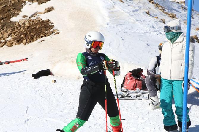 1月9日,伊朗女子高山滑雪运动员萨达夫·萨韦·谢姆沙基(左)在赛道起点处准备出发。新华社记者 高文成摄