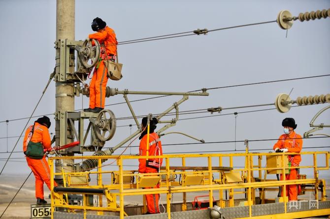 在南疆铁路鱼儿沟至望布区段,作业进行接触网验电。摆风亮摄 央广网发