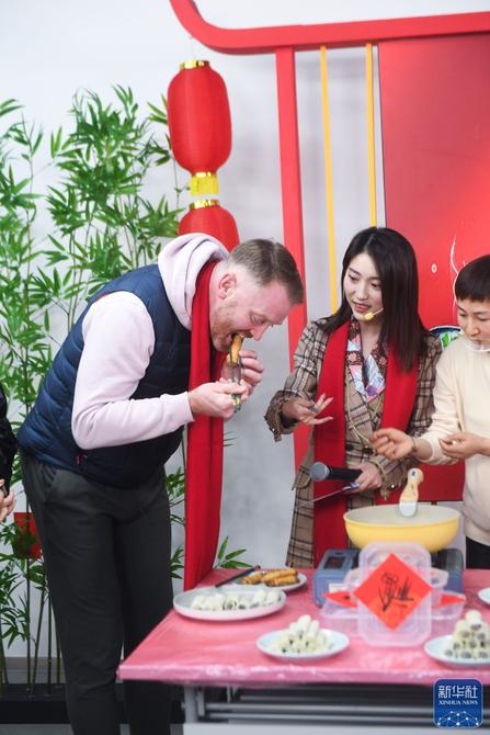↑1月26日,外籍居民在“云上村晚”现场品尝刚刚出锅的春卷。