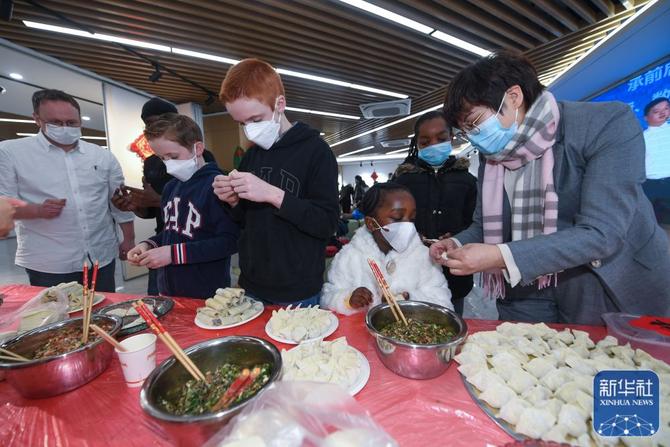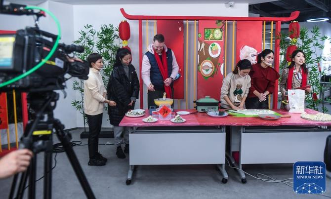 ↑1月26日,在中泰街道工作和生活的外籍居民在“云上村晚”活动现场学习包饺子。