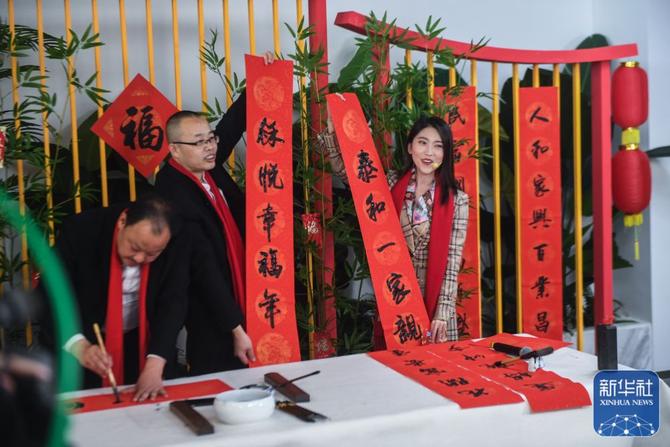 ↑1月26日,在中泰街道工作和生活的外籍居民在“云上村晚”活动现场学习写福字。