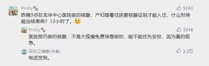 这是发生在1月8日深圳市卫健委公众号文章评论区的留言和回复。深圳市民"Prnliy"因为怀孕的妻子情况不稳定需要住院,在焦急等待核酸结果出来的同时于10:57给深圳卫健委留了言,没想到仅仅6分钟后,他就收到了深圳卫健委的 “霸气”回应。这一回应收到过万点赞,并在当晚冲上热搜第一。