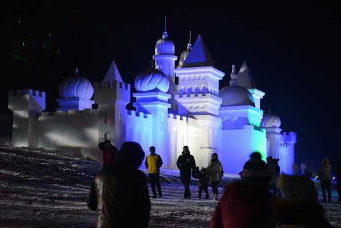 游客在阿尔山市冰雪节期间参观雪雕城堡。新华社记者 邹予 摄