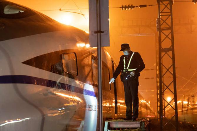 将近6点钟,动检车到站。从进站到发车这20分钟,人们忙碌着将货品搬进车厢,乘务员们检查座椅、防疫箱等车厢设备设施,擦拭座椅前的小桌板。