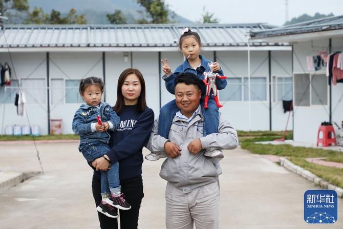 ↑杨兴义一家四口在板房宿舍前合影(1月25日摄)。新华社记者王瑞平摄