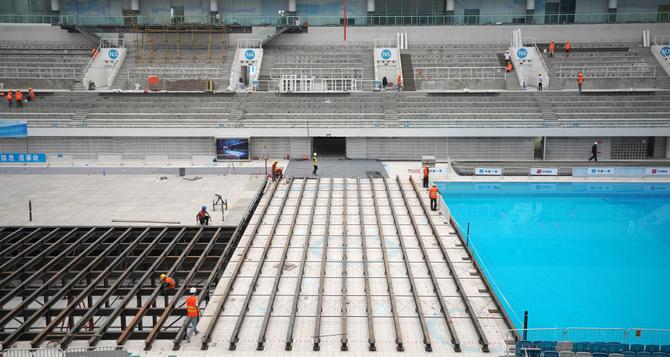 2019年7月10日,施工人员在进行“水立方”的可转换结构施工。新华社记者鞠焕宗摄