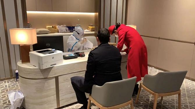 除夕下午,一辆满载外航机组人员的客车刚停下,酒店礼宾员立刻引导空乘人员沿划定的防疫动线前往大堂;前台接待员按照事先传真的空乘名单,查看护照、录入信息、发放房卡;防疫和安保人员回应问询、指导防疫,有条不紊。