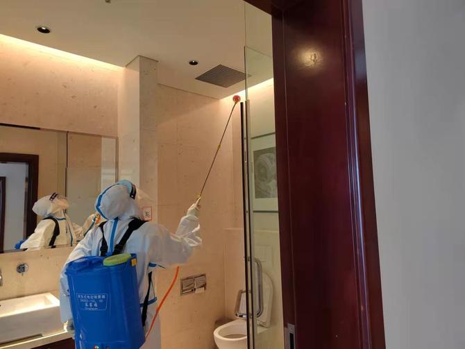 张继芹在对客房卫生间进行消杀。(受访者供图)
